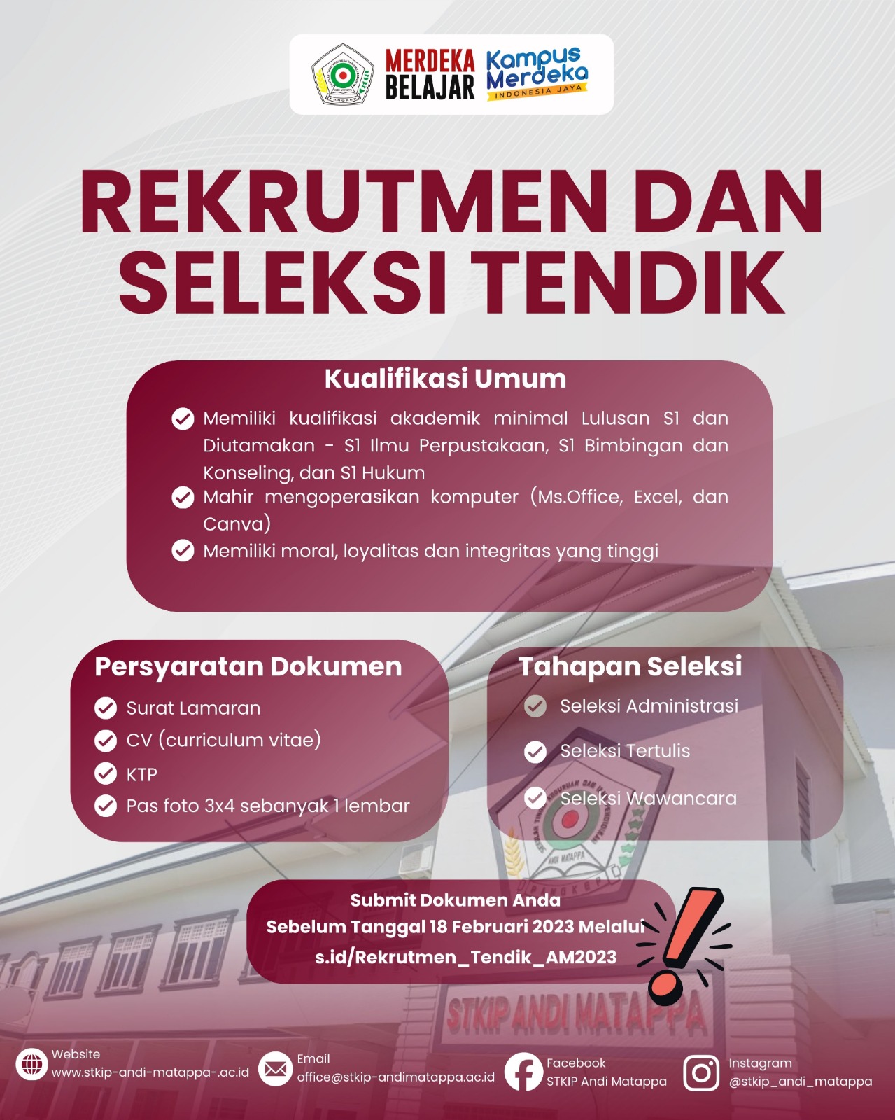 STKIP Andi Matappa membuka Rekrutmen dan Seleksi Tenaga Kependidikan (Tendik). Kesempatan ini ditujukan bagi pelamar yang memenuhi kualifikasi akademik dan memiliki integritas tinggi.