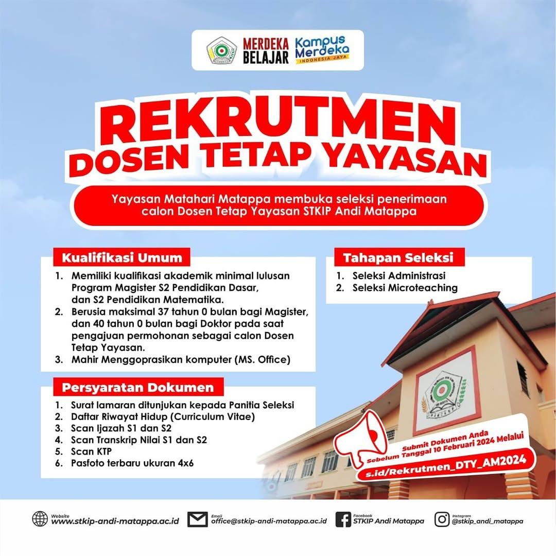 Yayasan Matahari Matappa membuka seleksi penerimaan Calon Dosen Tetap Yayasan untuk STKIP Andi Matappa. Kesempatan ini ditujukan bagi pelamar yang memenuhi kualifikasi akademik dan siap mengikuti tahapan seleksi yang ditetapkan.